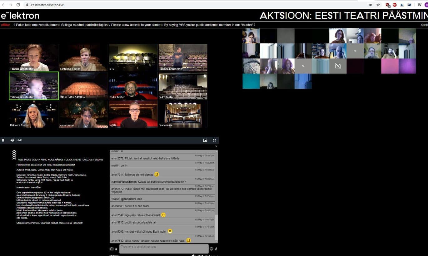 Esitasid Tartu Uue Teatri, Endla, Ugala, Rakvere Teatri, Vanemuise, Tallinna Linnateatri, Vene Teatri, Kanuti Gildi SAALi, STLi, VAT Teatri, Piip ja Tuut Teatri ning e⁻lektroni ühendatud jõud